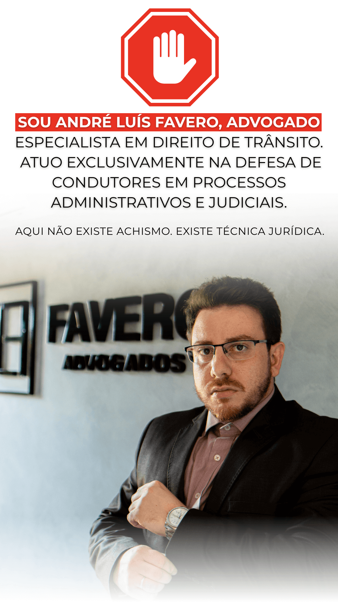 Sou André Luís Favero, advogado com especialização em Direito de Trânsito. Ao longo da minha carreira, tenho auxiliado inúmeros condutores a defenderem seus direitos em processos administrativos e judiciais, especialmente em casos de multas, suspensão e cassação da CNH, garantindo segurança jurídica e respeito à legislação vigente.